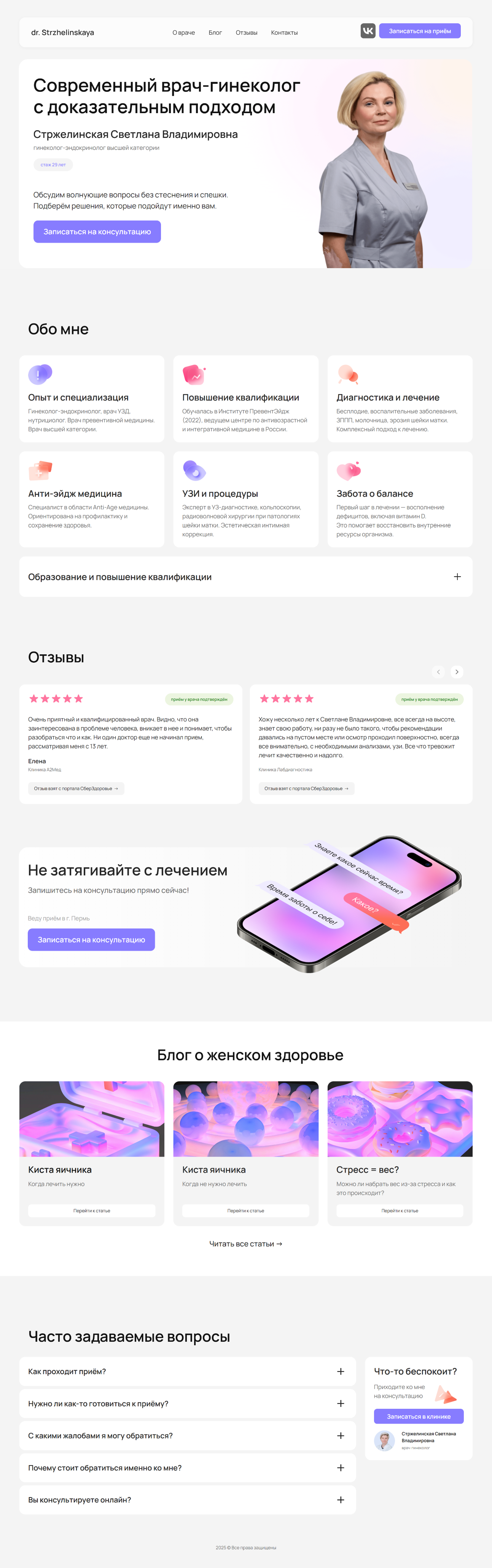 Сайт создан для практикующего врача-гинеколога Стржелинской С.В., принимающего пациенток в двух клиниках.